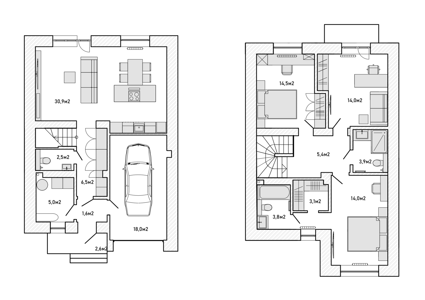 Двухэтажные коттеджи площадью от 146м² до 150.8м² с отдельным входом для каждой семьи, с теплым гаражом, парковочным местом перед домом и участком сзади дома. На первом этаже — просторная кухня-гостинная с французскими окнами, гостевой санузел и теплогенераторная.